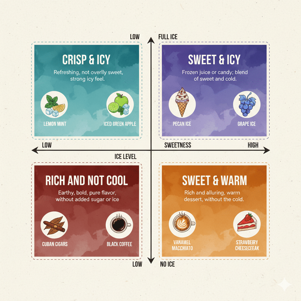 Watermelon Ice: A straightforward and refreshing flavor focusing on the sweet, juicy taste of watermelon with a powerful cooling menthol sensation on the exhale.