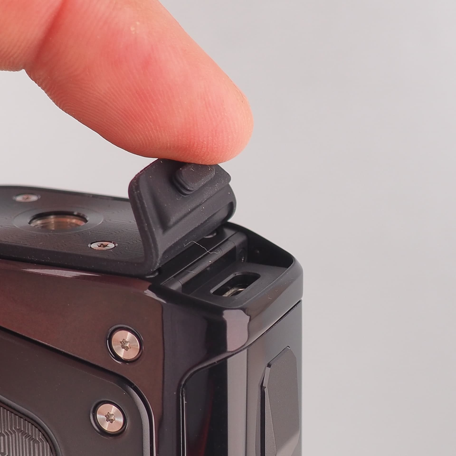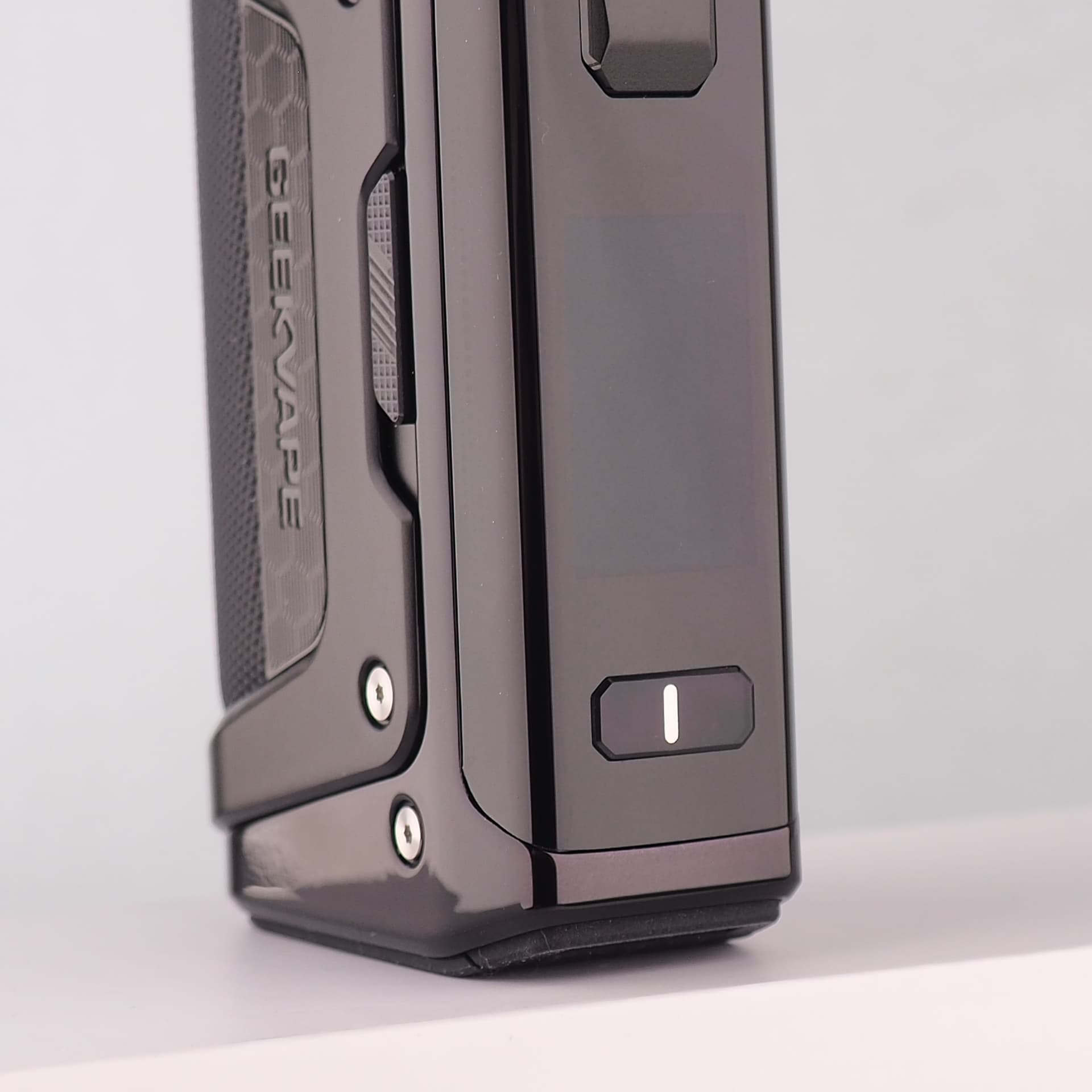 On the bottom of the device, the rubberized battery door is one of the smoothest GeekVape has made. It opens with a single slide of the latch to reveal dual 18650 battery compartments.