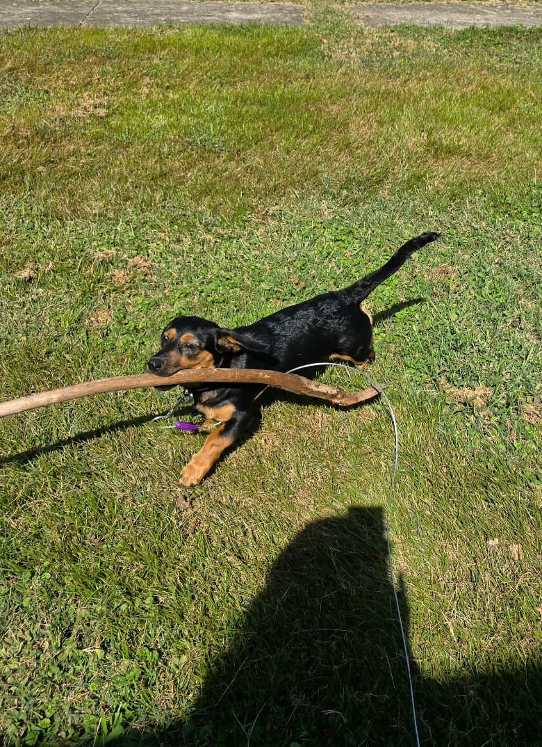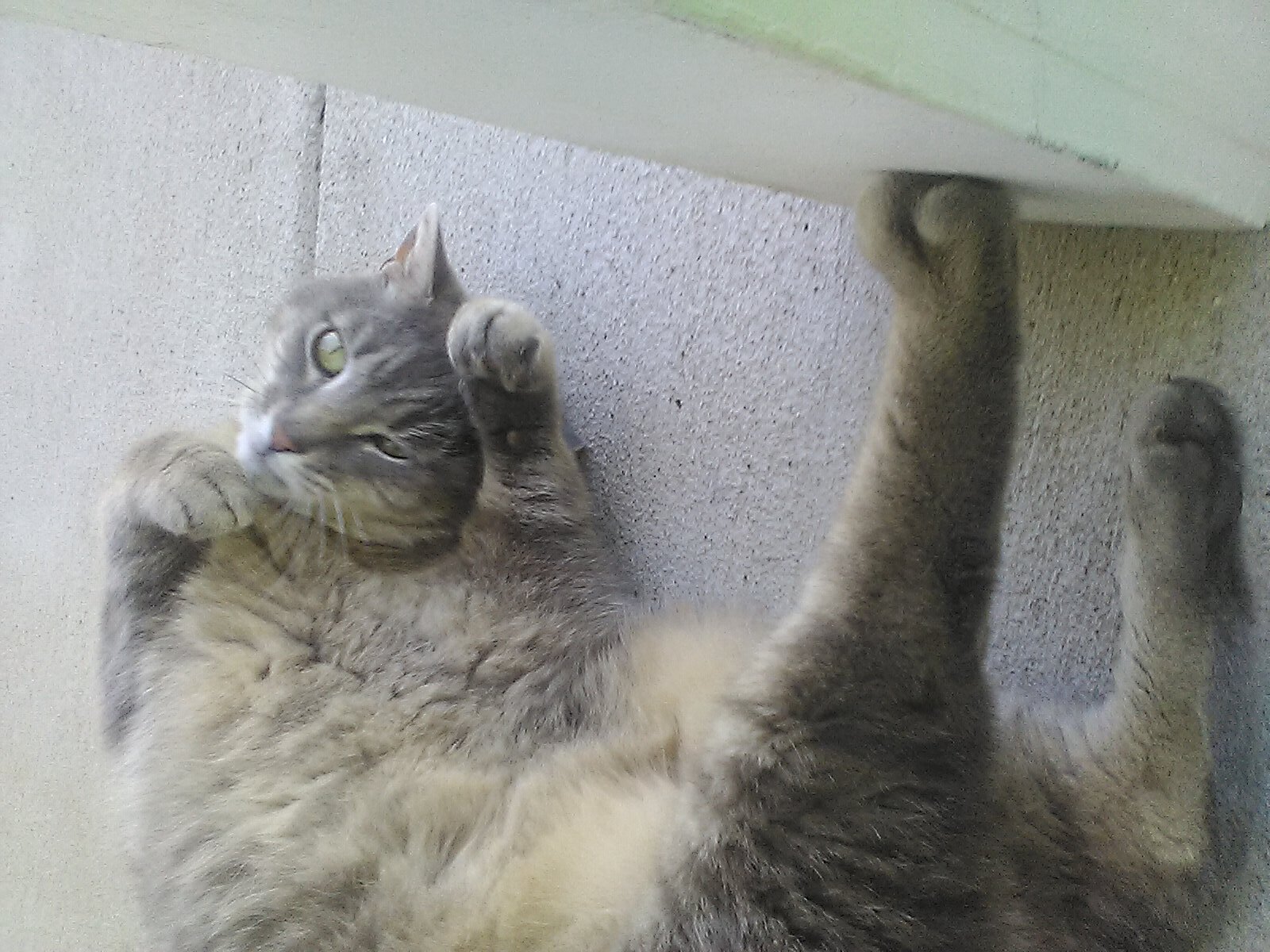 Every few minutes, he’ll jump up on my thigh. I’ll say “down”. Takes him something like 15 seconds to slowly slide down. I imagine that if I didn’t have jeans on, I’d bleed.