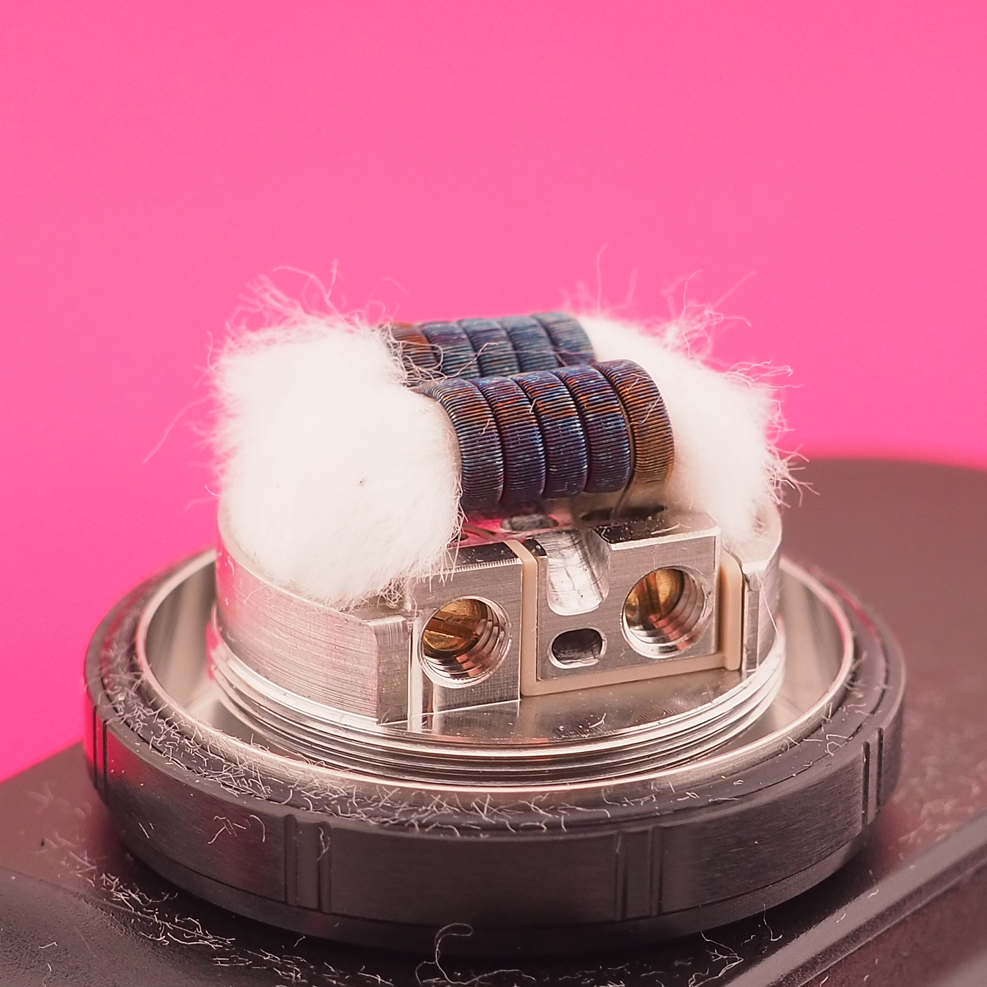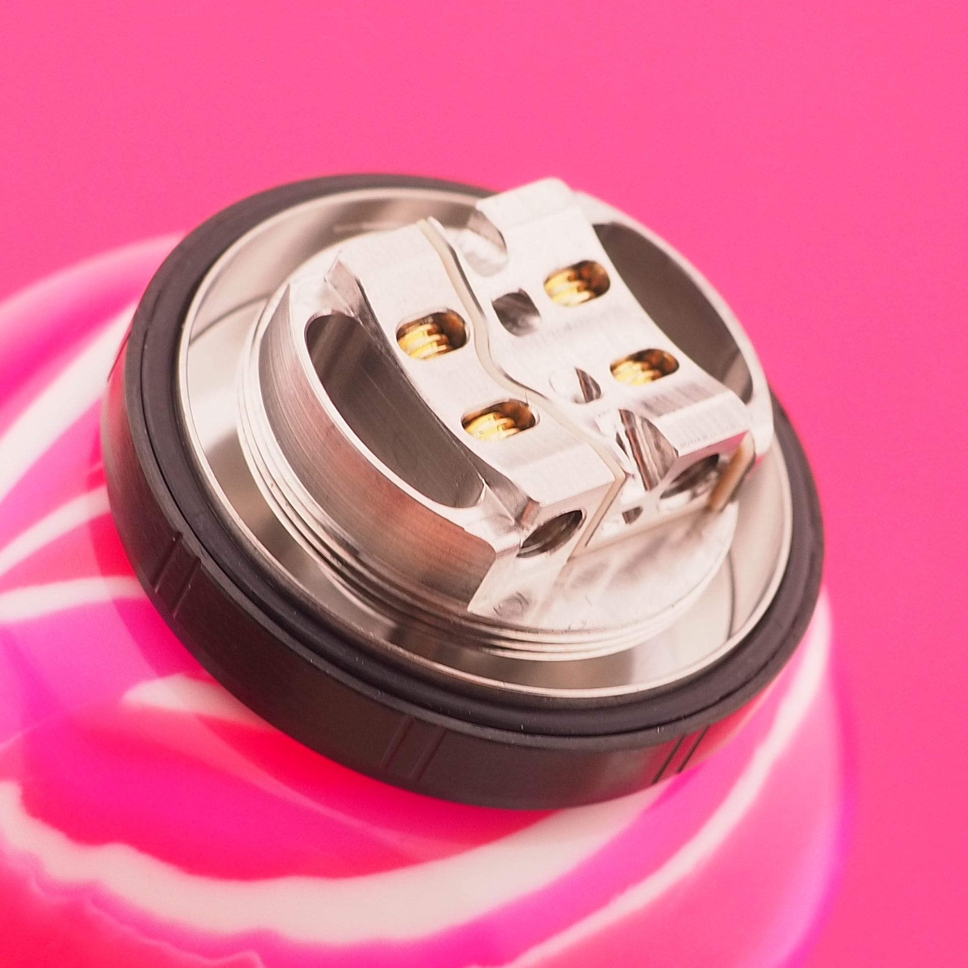 The deck is clearly designed with larger builds in mind. Generous wicking ports sit on either side, giving plenty of room for thicker cotton without crowding or choking the channels. A deep juice well beneath the deck provides extra liquid capacity and helps reduce the chance of dry hits during longer pulls.