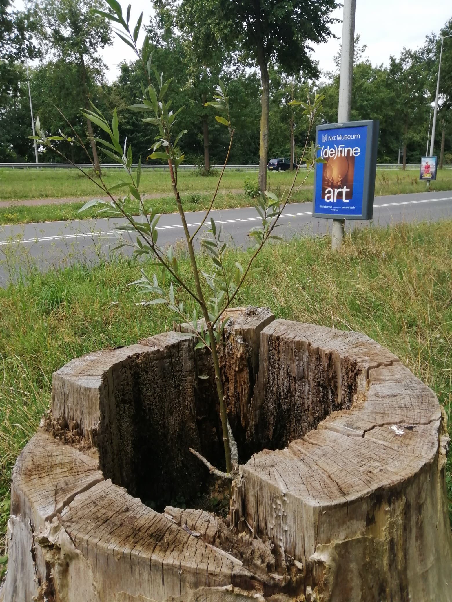 This is not the same tree growing back. It’s the seed of a another kind that has taken root in the middle of the space. The trunk is completely hollow, you can see the ground when you look into it.